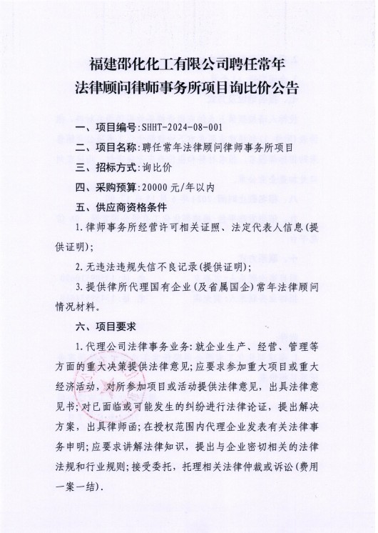福建邵化化工有限公司聘任常年法律顧問律師事務(wù)所項目詢比價公告